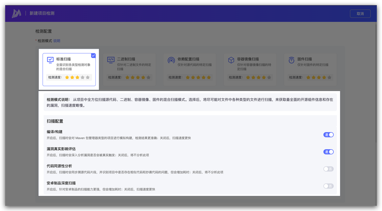 - 检测模式说明:标准扫描从项目中全方位扫描源代码、二进制、容器镜像、固件的混合扫描模式。选择后,将尽可能对文件中各种类型的文件进行扫描,来获取最全面的开源组件信息和存在的漏洞,扫描速度略慢。