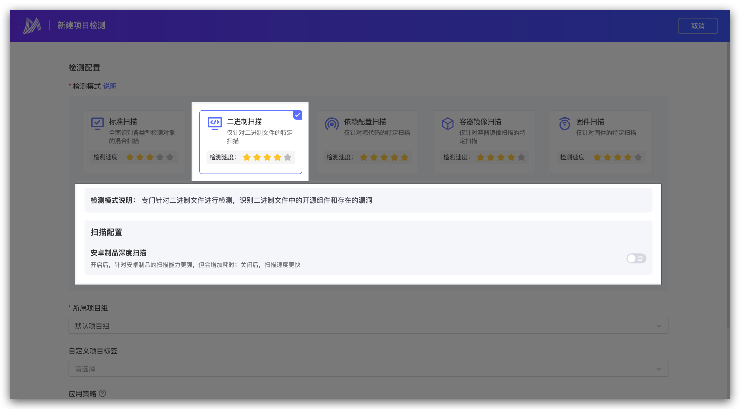 | 安卓制品深度扫描 | 开启后会 严重增加检测耗时 ,这个一般根据实际情况选择是否开启 | 开启后,针对安卓制品的扫描能力更强,但耗时较高; 关闭后,扫描速度更快 | 只针对 APK 或 AAR 文件 的扫描生效 |