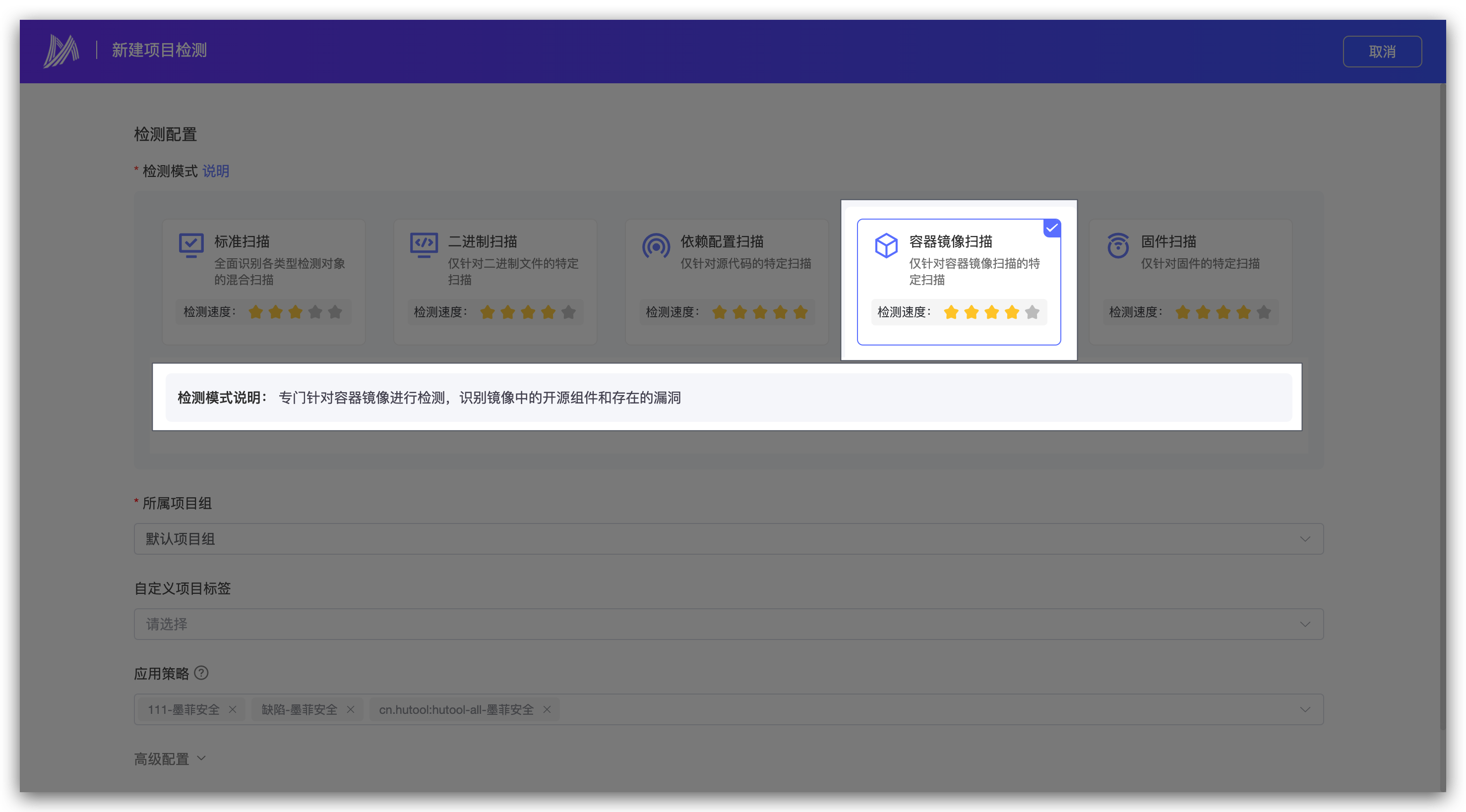 - 检测模式说明:专门针对容器镜像进行检测,识别镜像中的开源组件和存在的漏洞