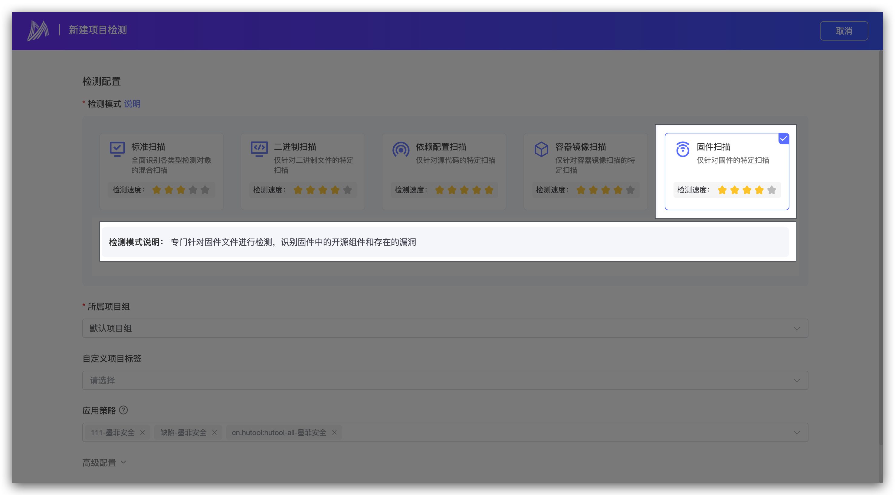 - 检测模式说明:专门针对固件文件进行检测,识别固件中的开源组件和存在的漏洞