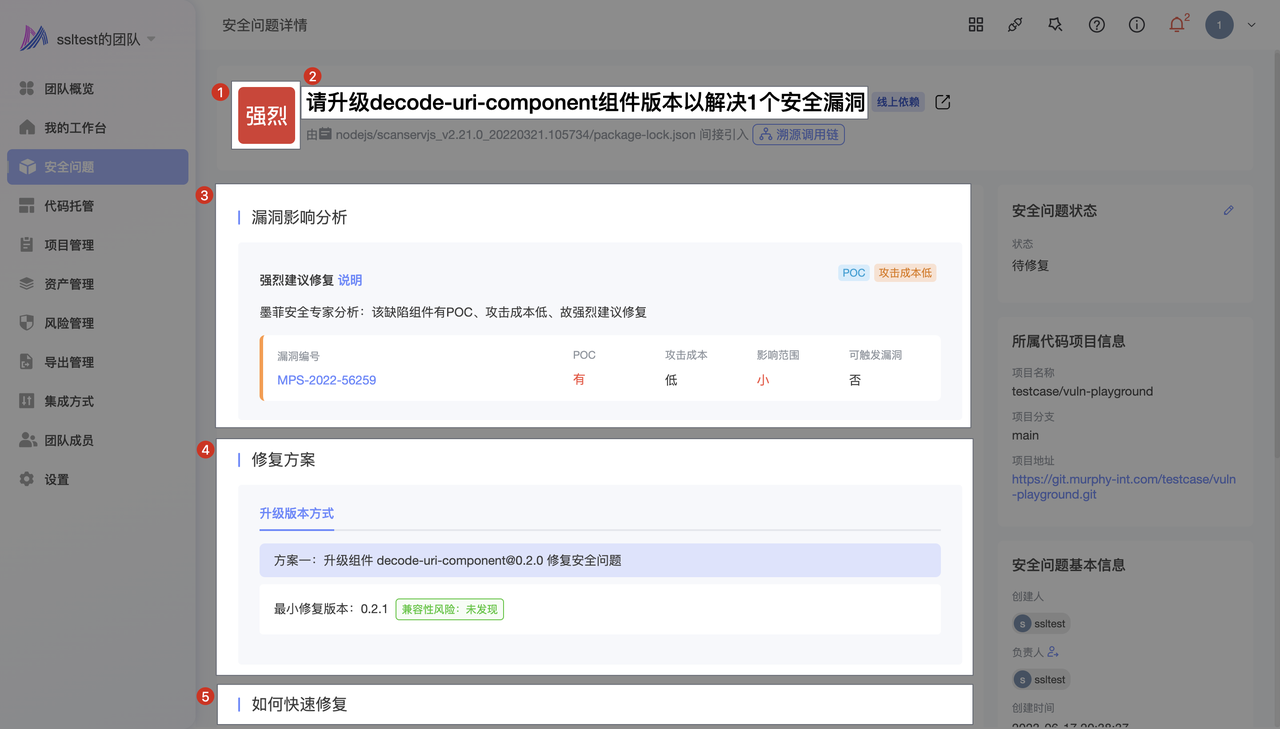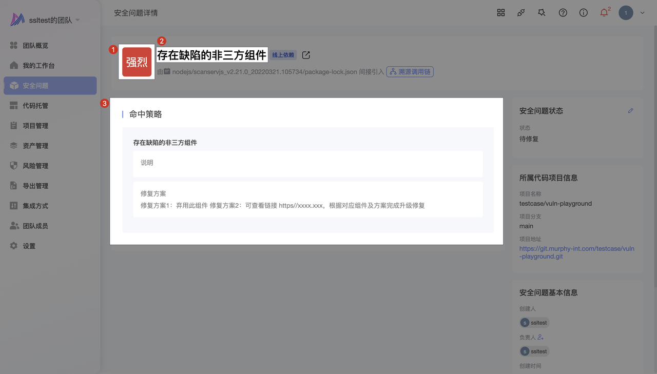 - 情况一:被命中的组件本就存在漏洞,那么该缺陷组件被策略命中后,组件详情会展示对应的漏洞信息,并将优先展示策略中设置的标题、处置等级、说明及修复方案。以下图一为未设置策略前组件展示,图二为被命中策略后组件展示