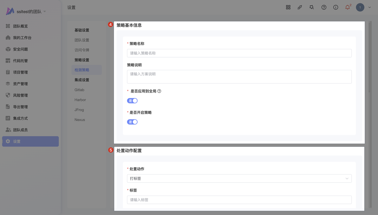- 点击 设置 -> 策略设置 -> 检测策略 -> 添加 -> 输入 策略基本信息 -> 选择处置动作为 打标签 -> 输入 标签名称 -> 配置 组件规则 -> 配置 漏洞规则 -> 点击 确认