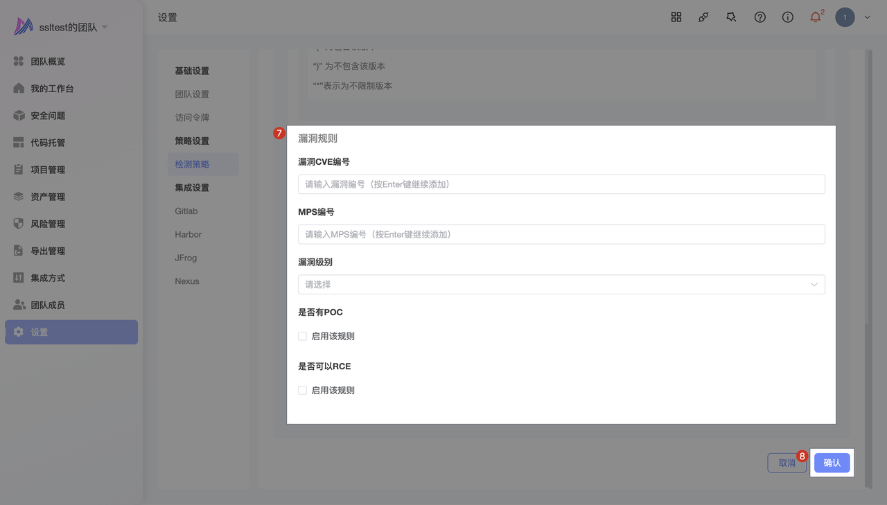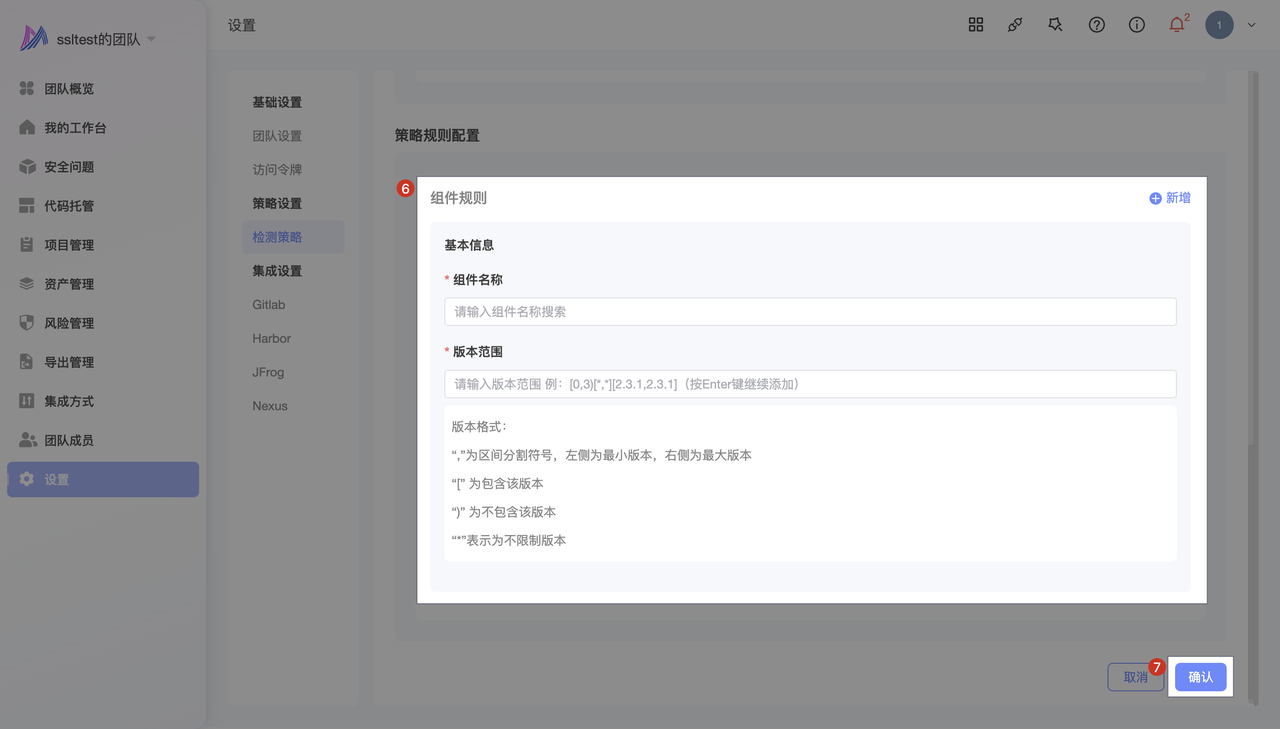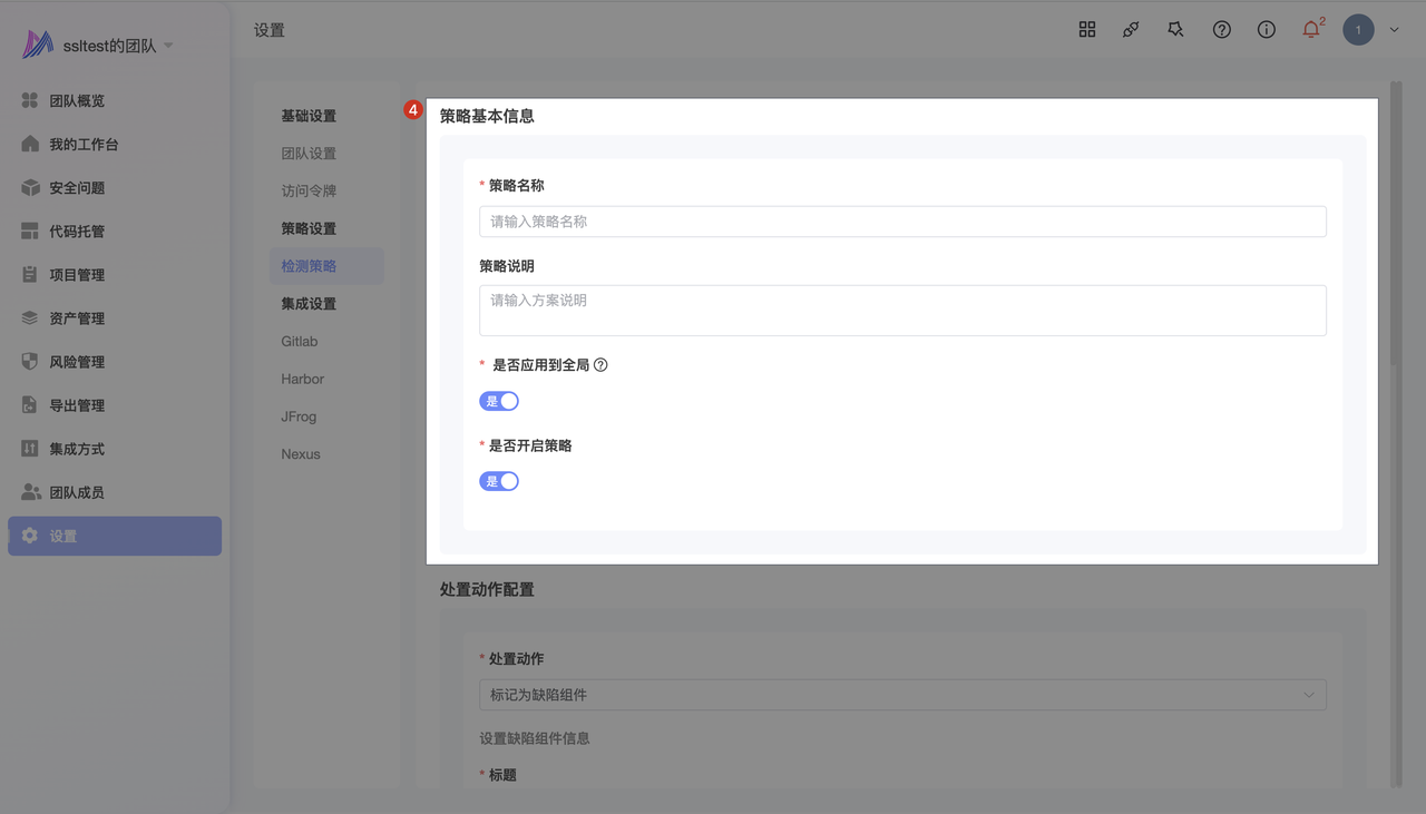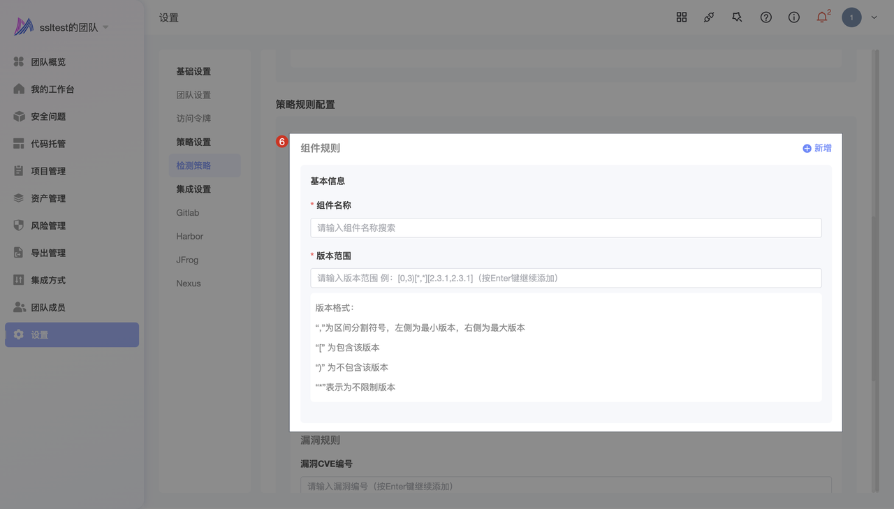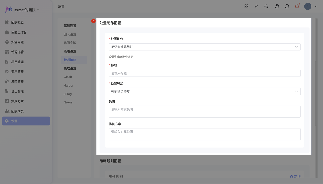 - 点击 设置 -> 策略设置 -> 检测策略 -> 添加 -> 输入 策略基本信息 -> 选择处置动作为 标记为缺陷组件 -> 设置 缺陷组件信息 -> 配置 组件规则 -> 点击 确认