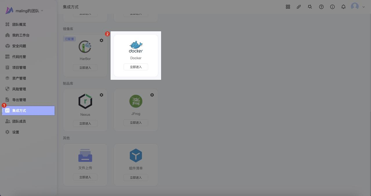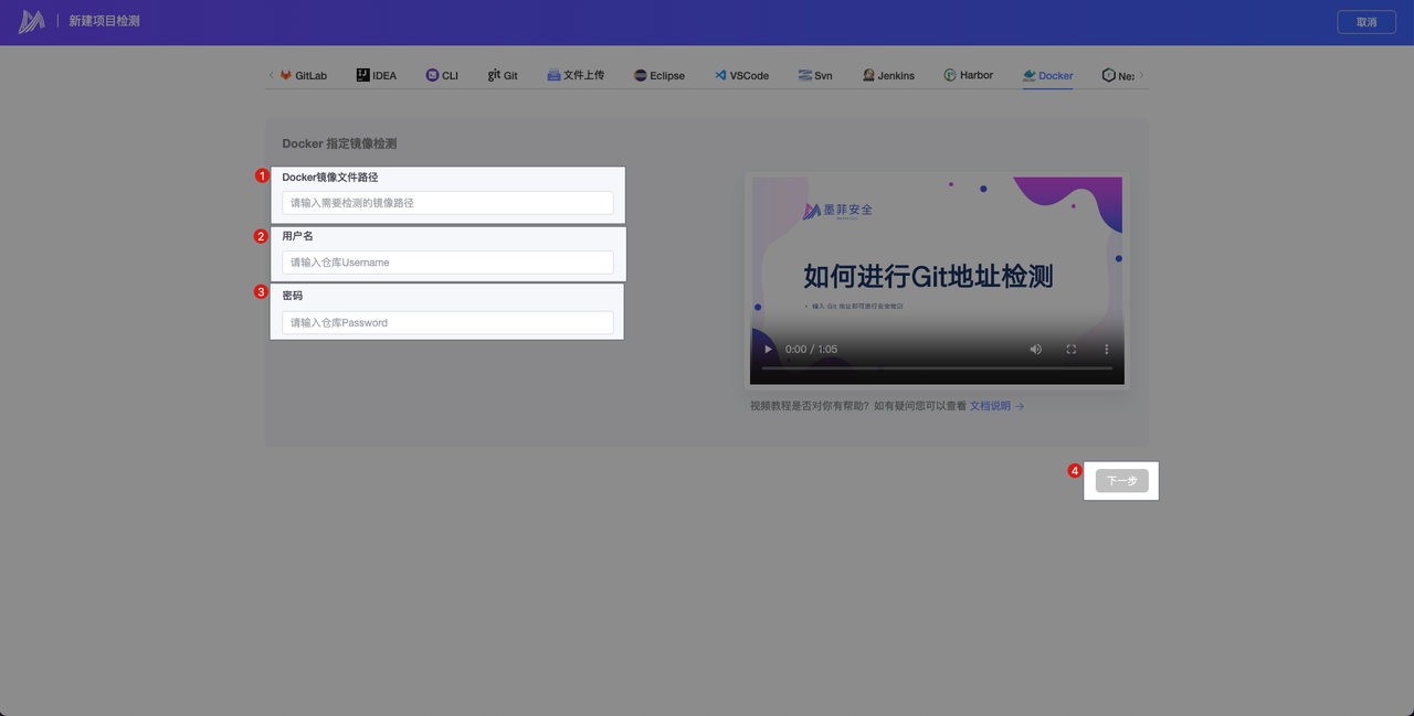 - 点击 Docker 镜像文件路径 -> 用户名 -> 密码 -> 下一步 用户名:docker 仓库的 username 密码:docker 仓库的 password