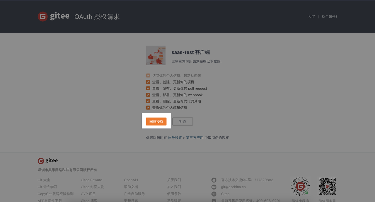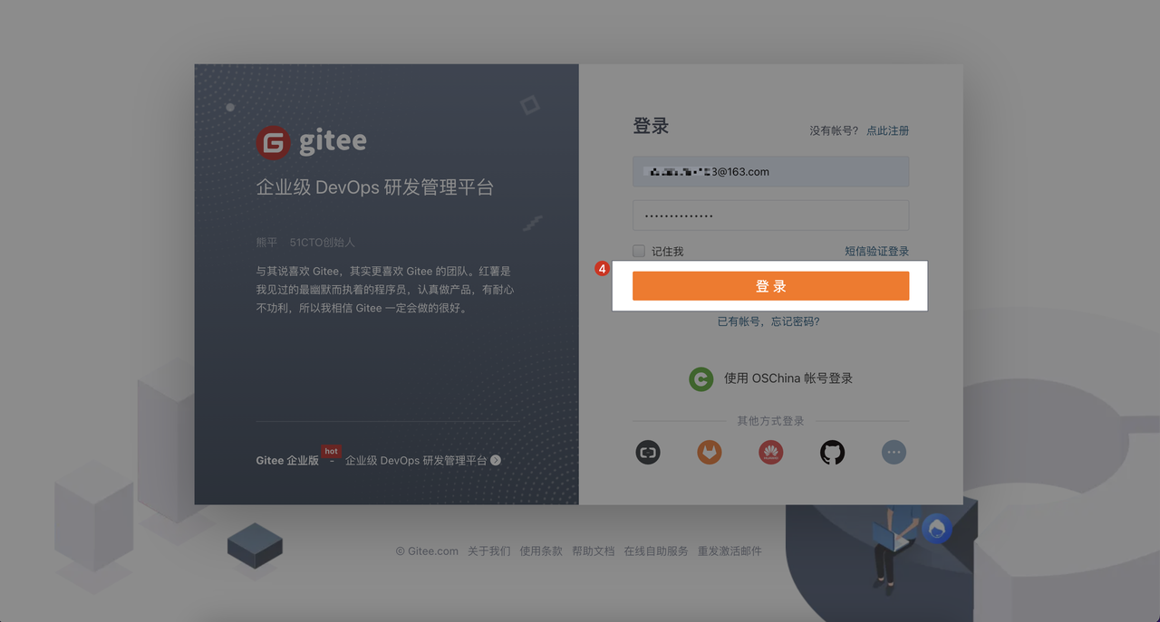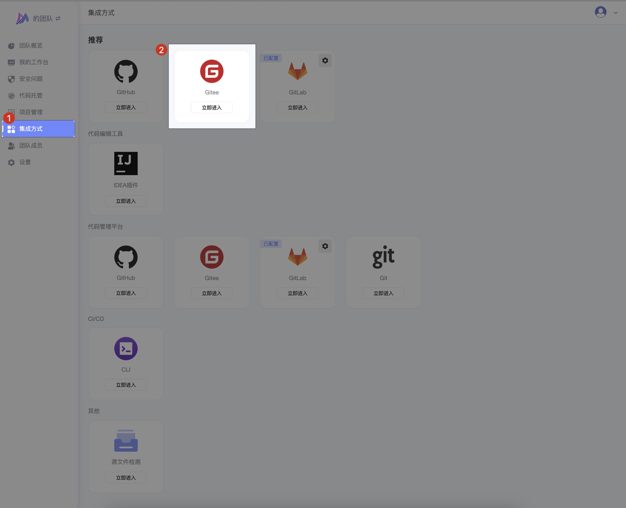 - 点击 集成方式 -> Gitee 立即进入 -> Gitee 授权