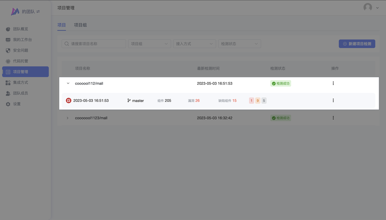 - 点击 检测项目 -> 检测结果,即可看到该次检测生成的安全报告
