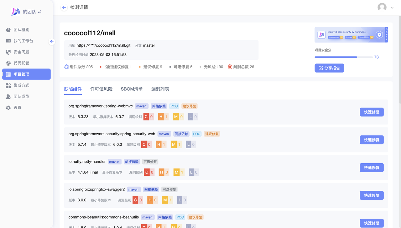 墨菲安全可以与 Gitee 代码仓库进行集成,直接对账号内的一个/多个/全部代码仓库进行安全检测,并生成安全报告。安全报告会显示所有发现的安全漏洞,包括其危险级别、位置和建议的修复方法。通过这些报告,用户可以及时发现和修复代码中的安全问题。同时,还可以生成项目安全报告,方便用户查看项目安全情况。