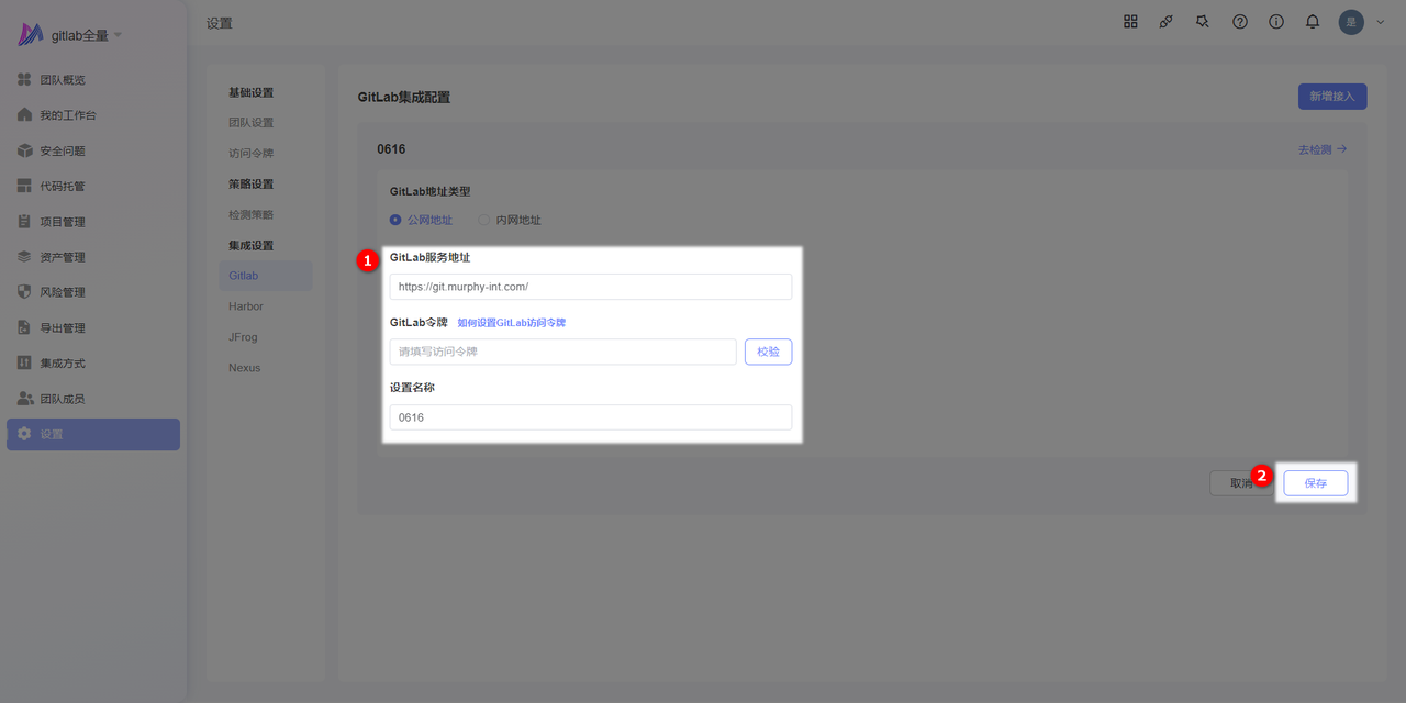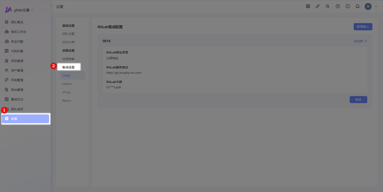 通过集成设置与管理,您可以查阅历史配置的 Gitlab 、Harbor 、JFrog 、Nexus服务地址、令牌、密码等信息,并可进行修改,帮助您了解目前团队的代码接入情况及避免因令牌、密码过期导致的检测失败。