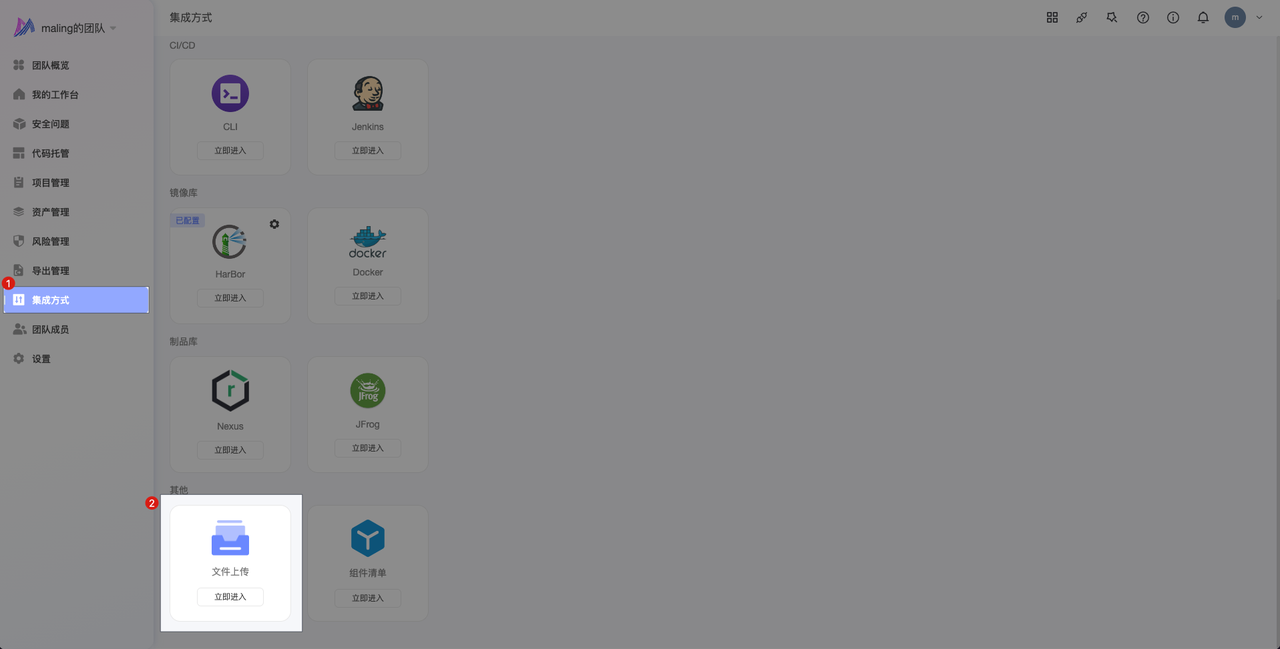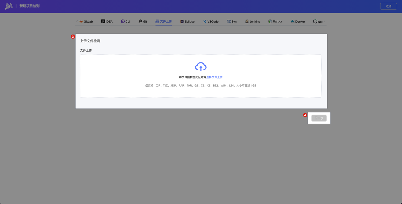 - 点击 集成方式 -> 文件上传 -> 上传文件检测 -> 下一步