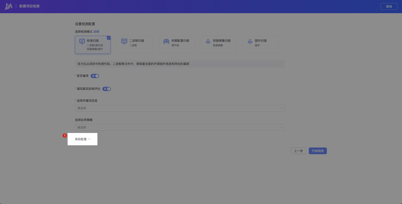 - 方式一:标准扫描 介绍:全方位从项目中的源代码、二进制等文件中,获取最全面的开源组件信息和存在的漏洞