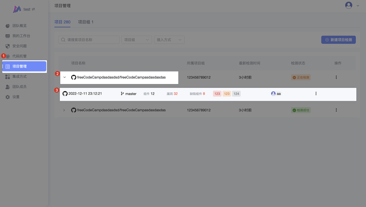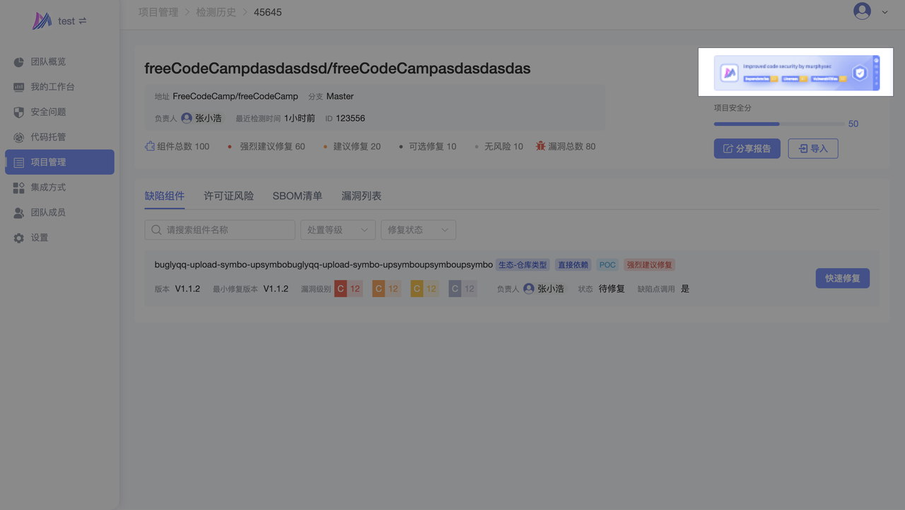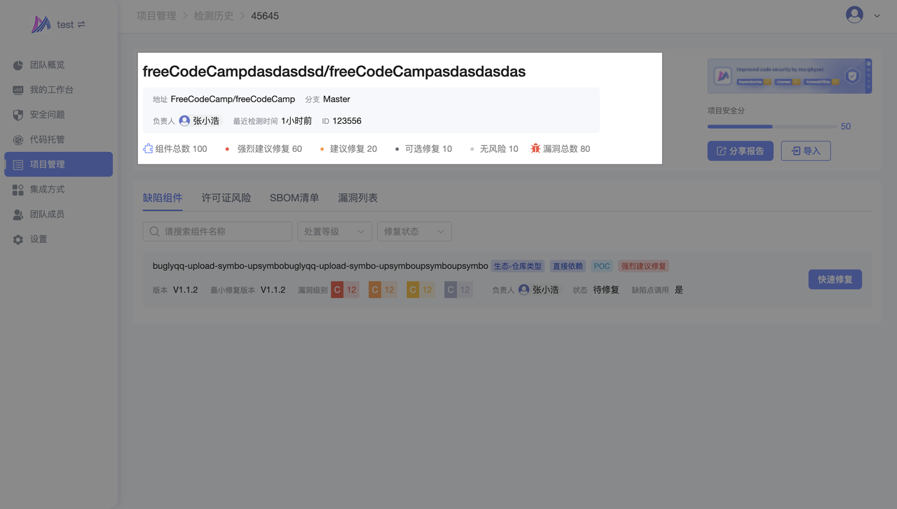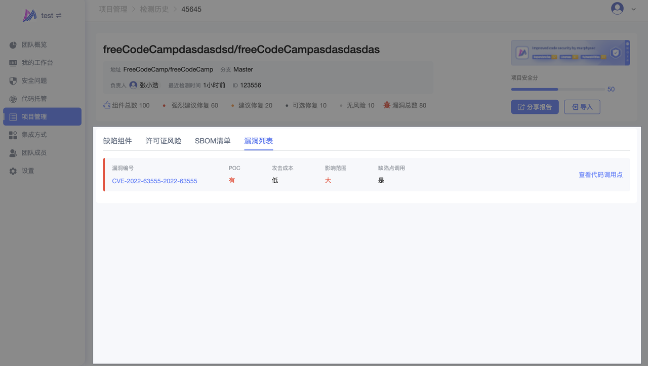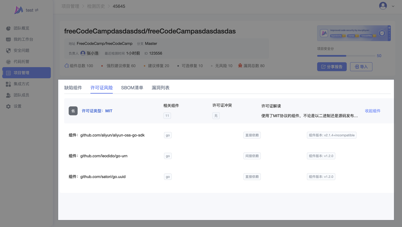 展示项目地址、项目分支、负责人、检测时间、风险基本信息等