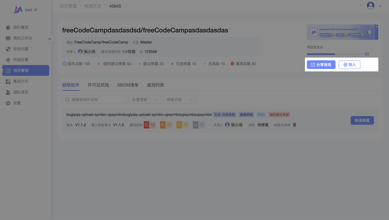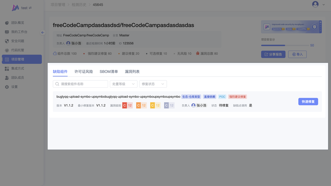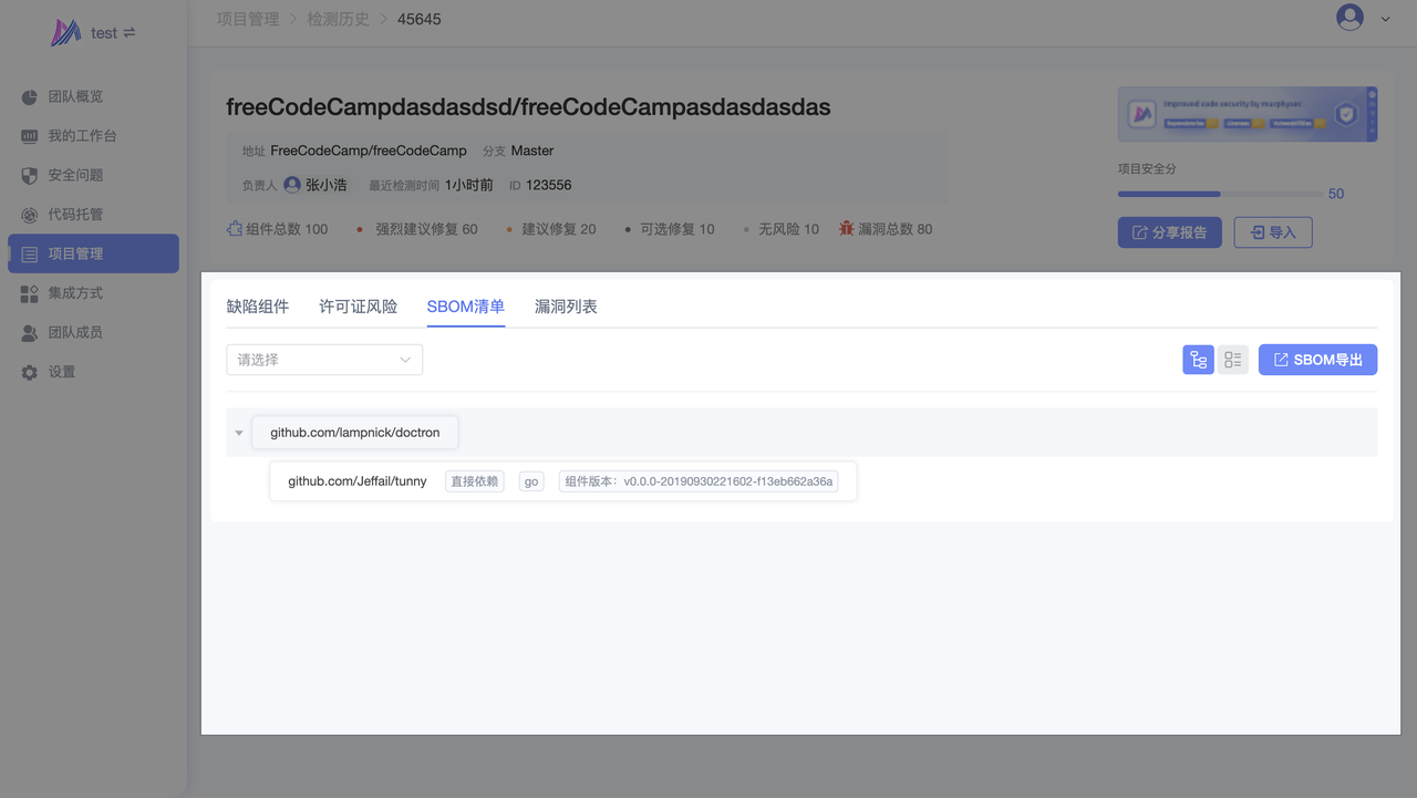 检测完成后会生成项目安全报告,可以查看缺陷组件、许可证风险、SBOM 清单、漏洞列表等信息,更全面的掌握项目安全质量。