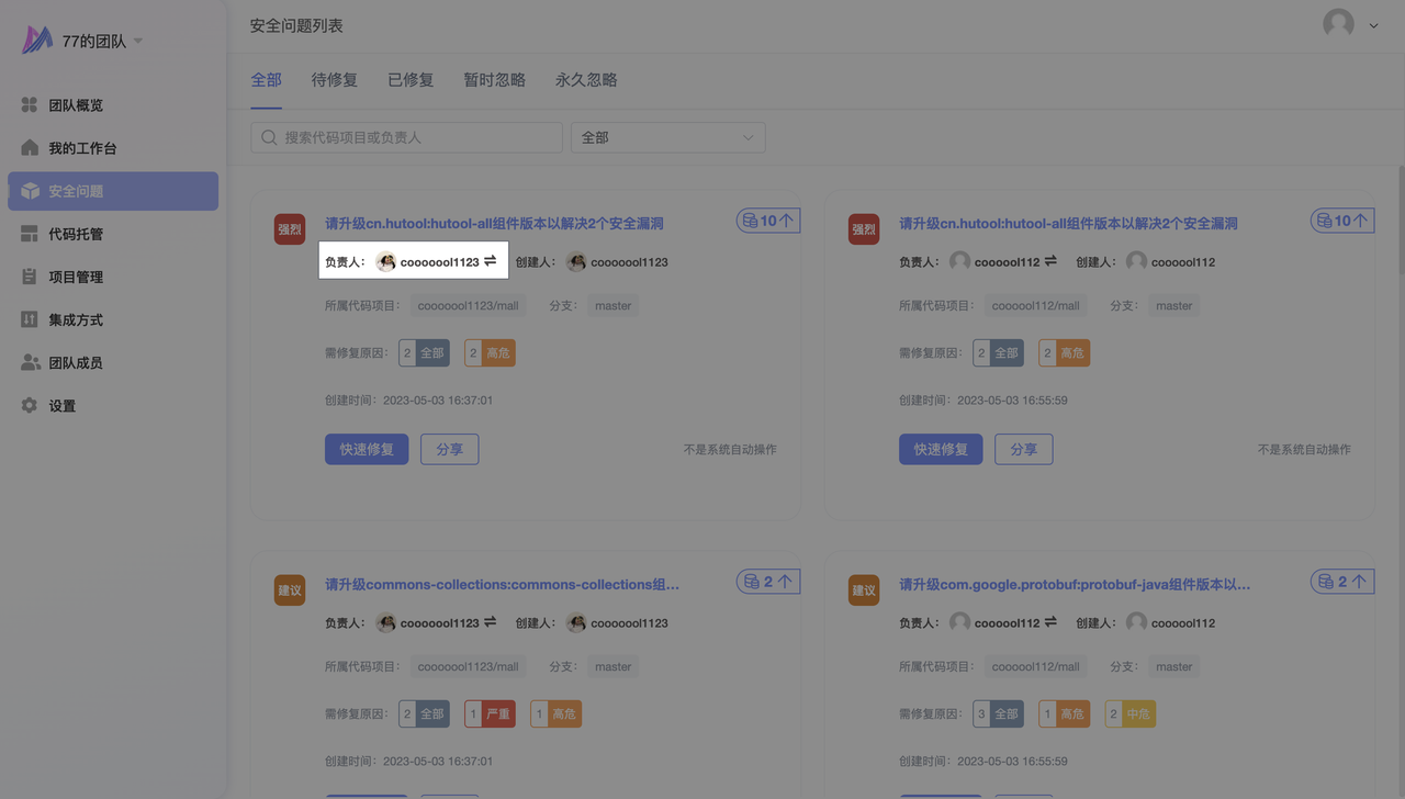 - 在安全列表页,对某一安全问题,点击 负责人 按钮,可以将安全问题进行指派。指派成功后,展示该指派人的名字及头像。在指派时,指派列表中优先展示该代码项目中最近一次 commiter 的用户,并显示对应的推荐原因