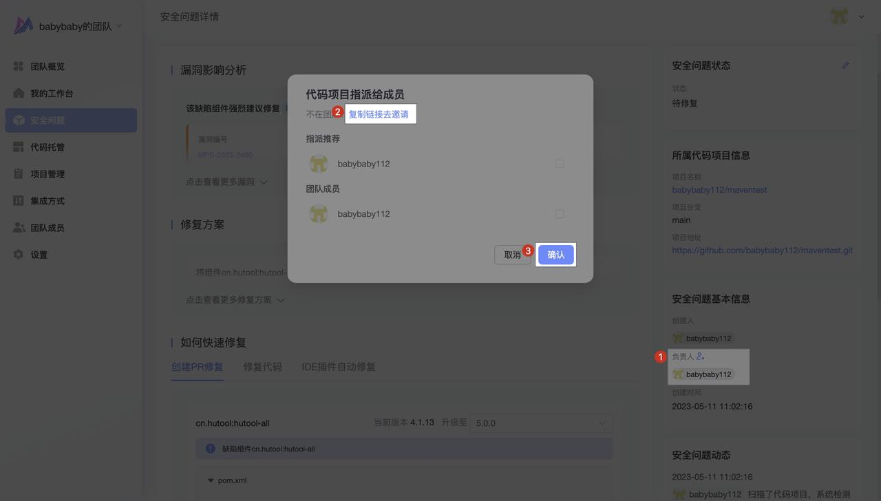 - 查看项目检测结果详情时,点击 负责人 按钮,选择对应的团队成员或复制链接。在指派时,指派列表中优先展示该代码项目中最近一次提交 commit 的用户。