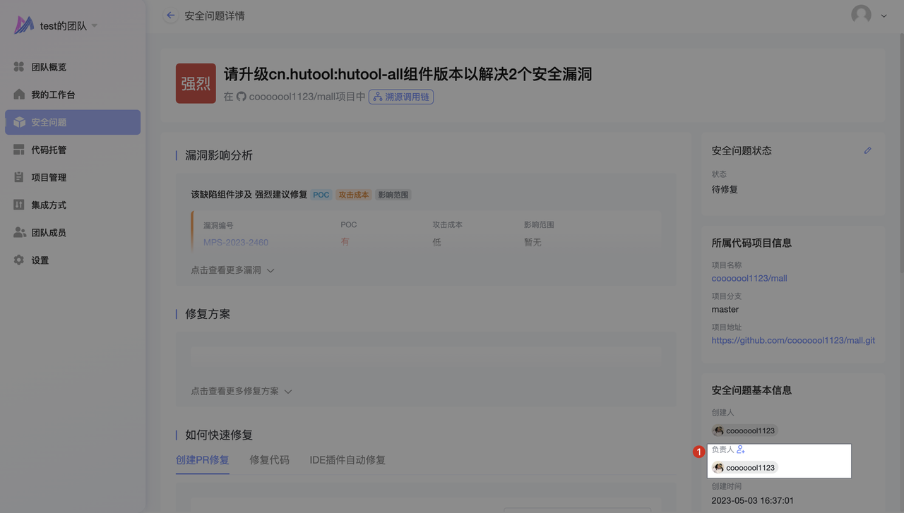 ¶ 2.1 在安全问题列表/团队概览进行问题指派(方式一)