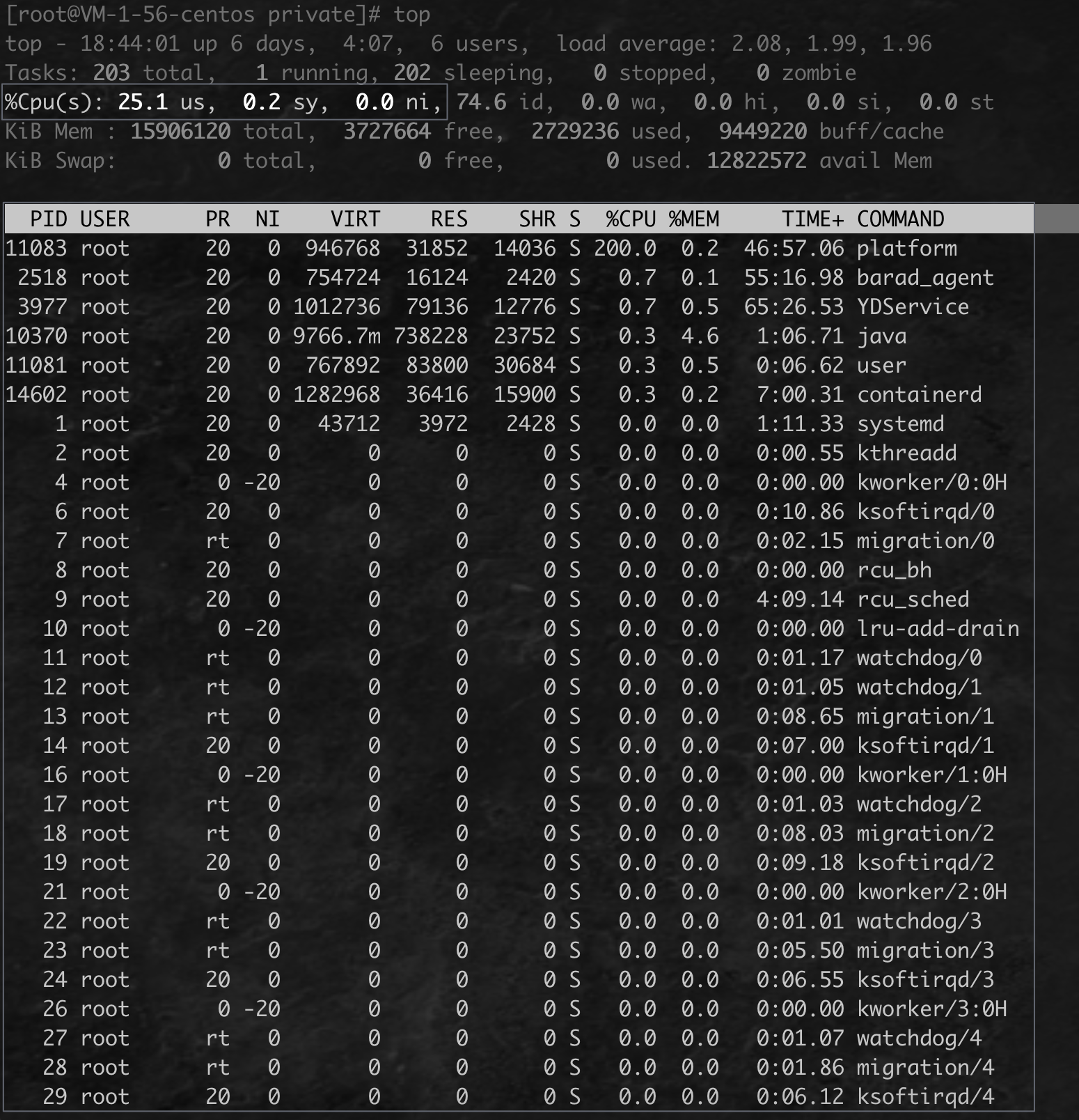 top命令来查看当前的 CPU 使用率,并查看占用 CPU 资源最高的几个进程在打开的界面中,您可以看到